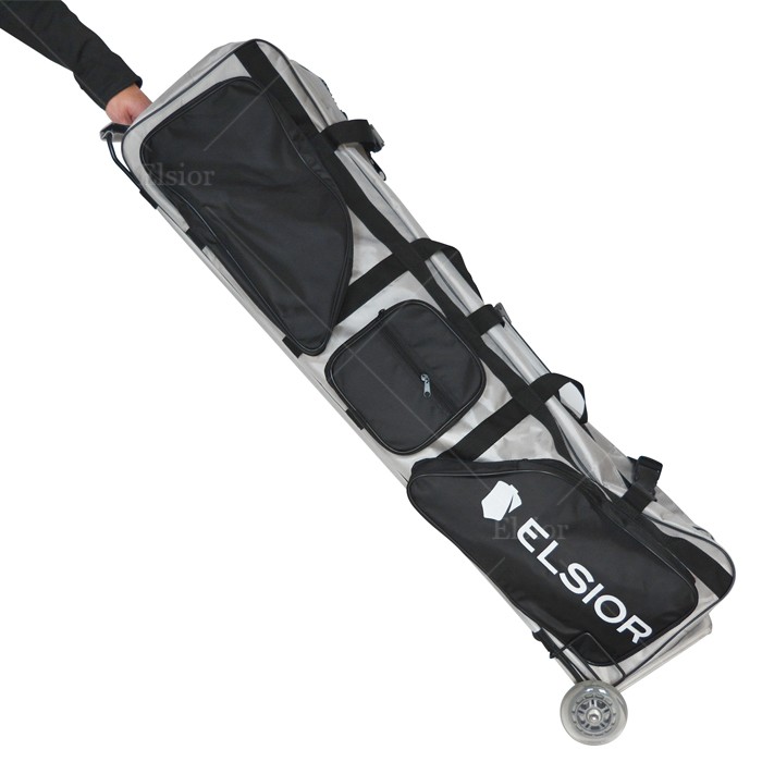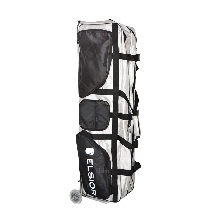 Torba szermiercza na kółkach z dwoma oddziałami w środku, zapinane za zamek. Długość 120 cm, szerokość 40 cm. Ma 4 duże kieszeni i 2 małe na zewnętrznej stronie.
